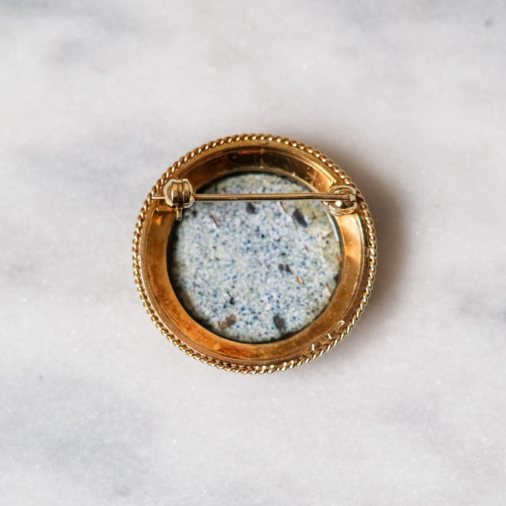 An enchanting antique 14K Rosy Gold Painted Floral Rose Brooch with three roses in white, pink and yellow surrounded by a backdrop of a variety of leaves and florals. It is framed by a circular border that has gold rope rustic detailing for texture, a perfect piece for the nature lover.