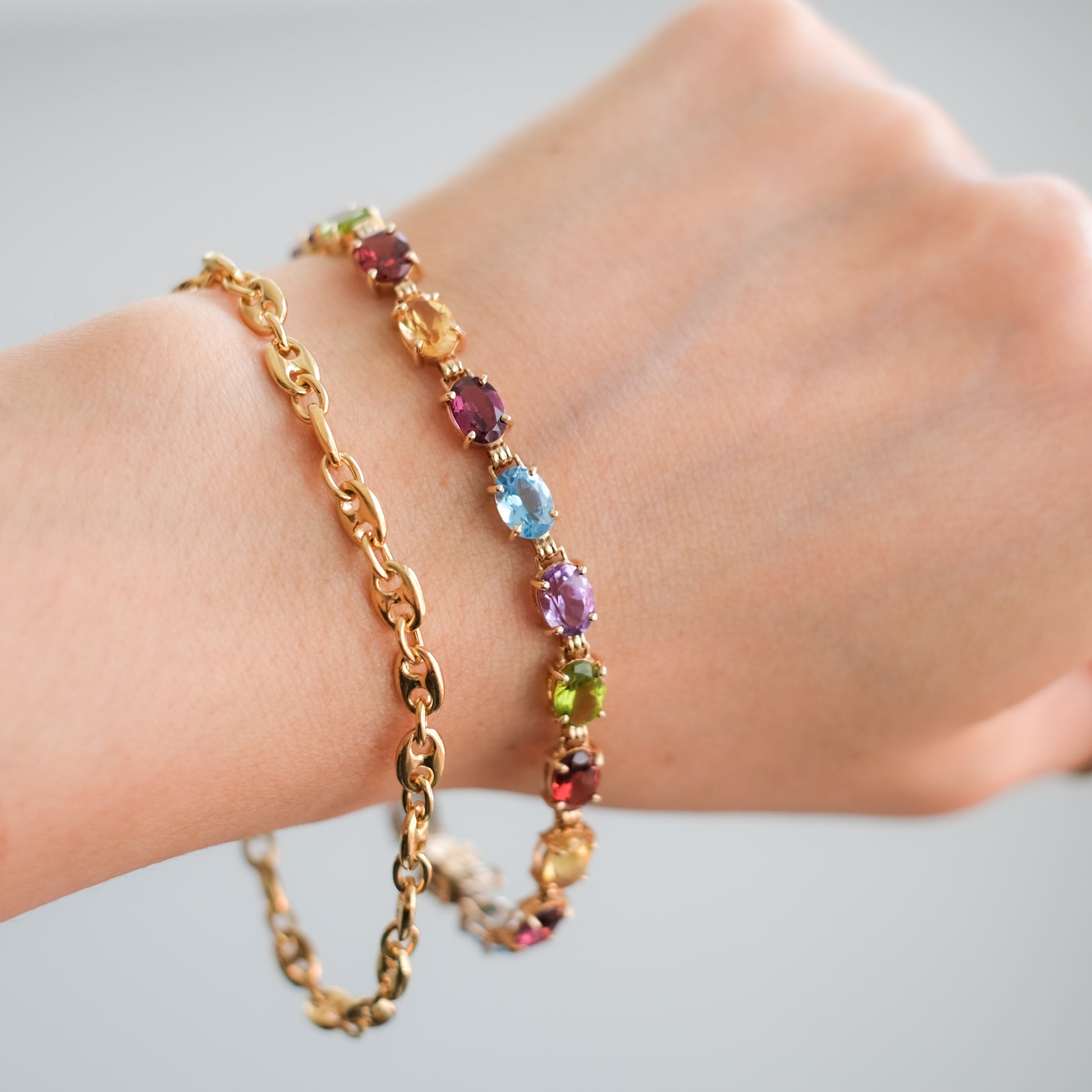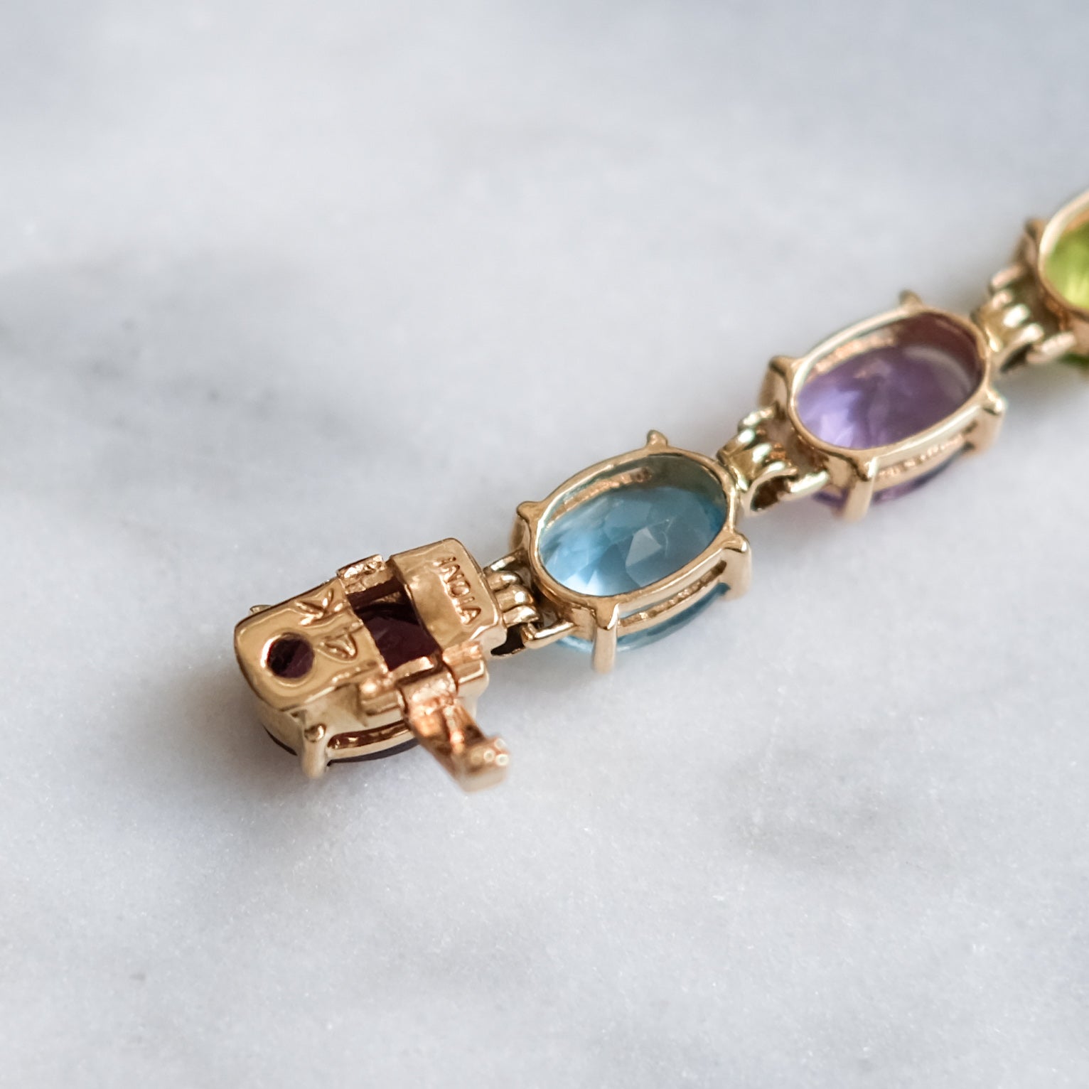 A vintage Multi-Gem bracelet from the 1980s-90s crafted in 14K Yellow Gold featuring alternating Peridot, Amethyst, Topaz, Garnet and Citrine gemstones.